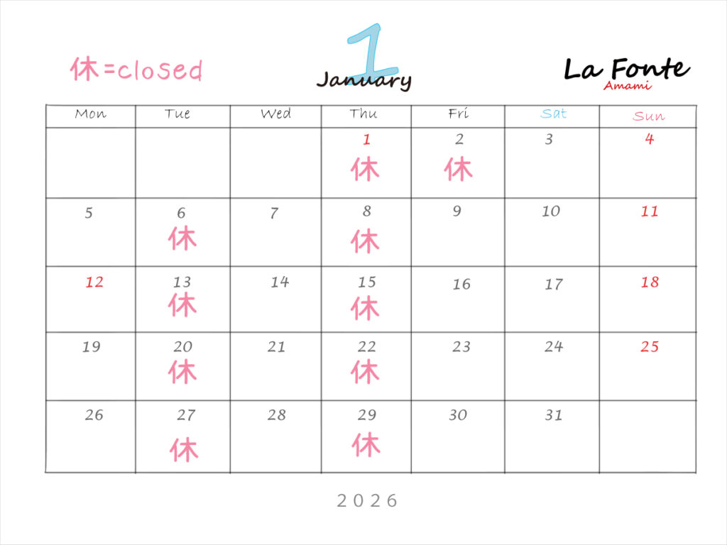 12月24日(火)は営業、12月26日(木)に休業いたします。 年末は12月30日まで営業、新年1月2日から営業いたします。